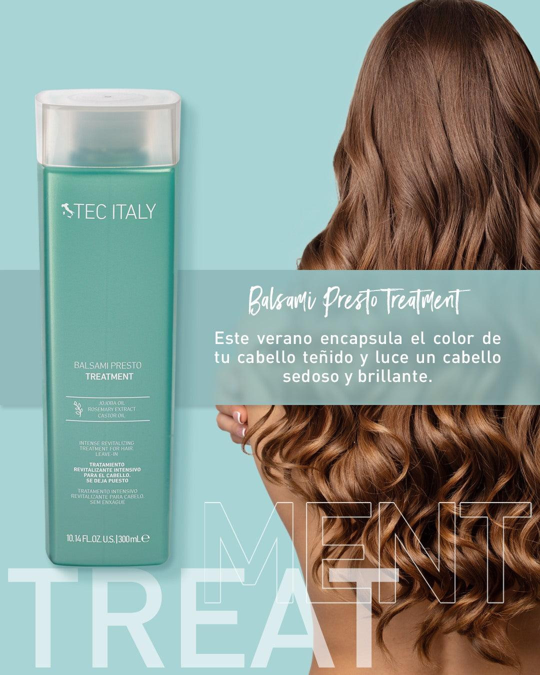 Balsami Presto de Tec Italy es un tratamiento capilar intensivo y revitalizante tipo leave-in (sin enjuague) diseñado para hidratar, desenredar y restaurar la suavidad y el brillo del cabello. Es ideal para todo tipo de cabello, especialmente aquel que está seco, teñido o procesado químicamente. Gracias a sus complejos botánicos y al sistema TRICEL-R, ayuda a reducir el frizz, facilitar el peinado y proteger la fibra capilar contra los rayos UV.