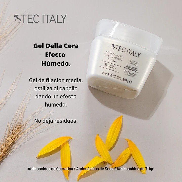 La Cera Gel Della Cera Effetto Humedo de Tec Italy es un estilizador híbrido de fijación media que combina la moldeabilidad de una cera con el control de un gel para lograr peinados modernos con un acabado mojado y brillante, sin dejar residuos pegajosos. Se usa aplicando una pequeña cantidad sobre el cabello seco o húmedo.