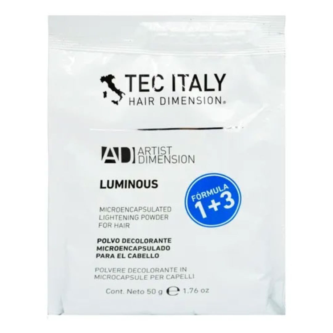 Luminous de Tec Italy (50 grs) es un polvo decolorante microencapsulado de alto rendimiento, no volátil, que aclara hasta 7 niveles. Su fórmula contiene pigmentos violetas que neutralizan reflejos amarillos, logrando rubios más fríos y uniformes, ideal para técnicas de decoloración profesional cuidando la estructura capilar.
