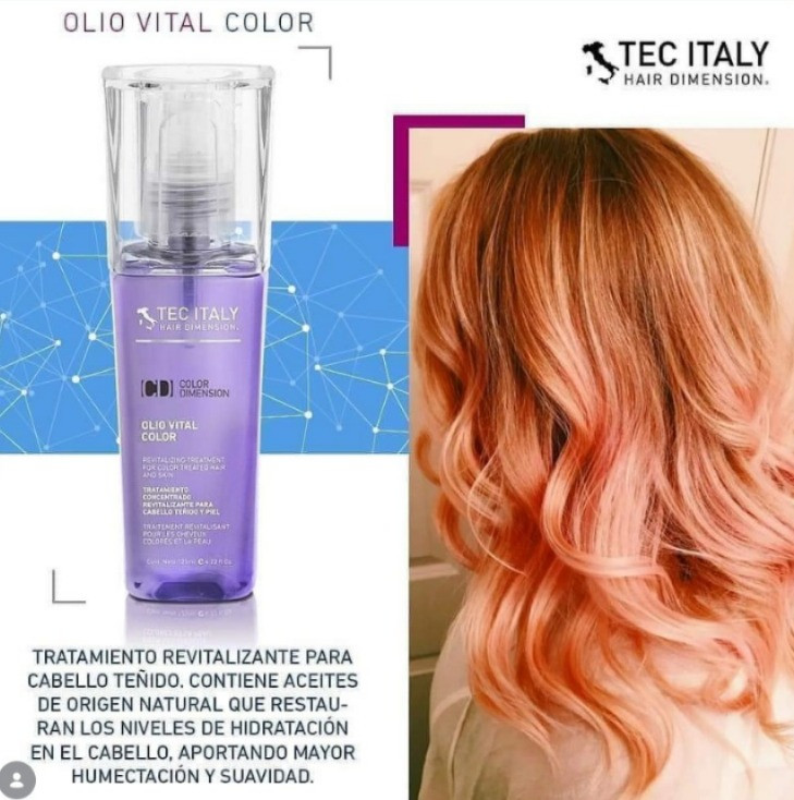 Olio Vital Color de Tec Italy es un tratamiento concentrado diseñado específicamente para cabello teñido y reseco. Su fórmula con aceites naturales (como argán y macadamia) hidrata profundamente, suaviza, elimina el frizz, aporta brillo y ayuda a sellar la cutícula para proteger y prolongar la duración del color. Además, contiene el complejo TRICEL-R para proteger contra los rayos UV.