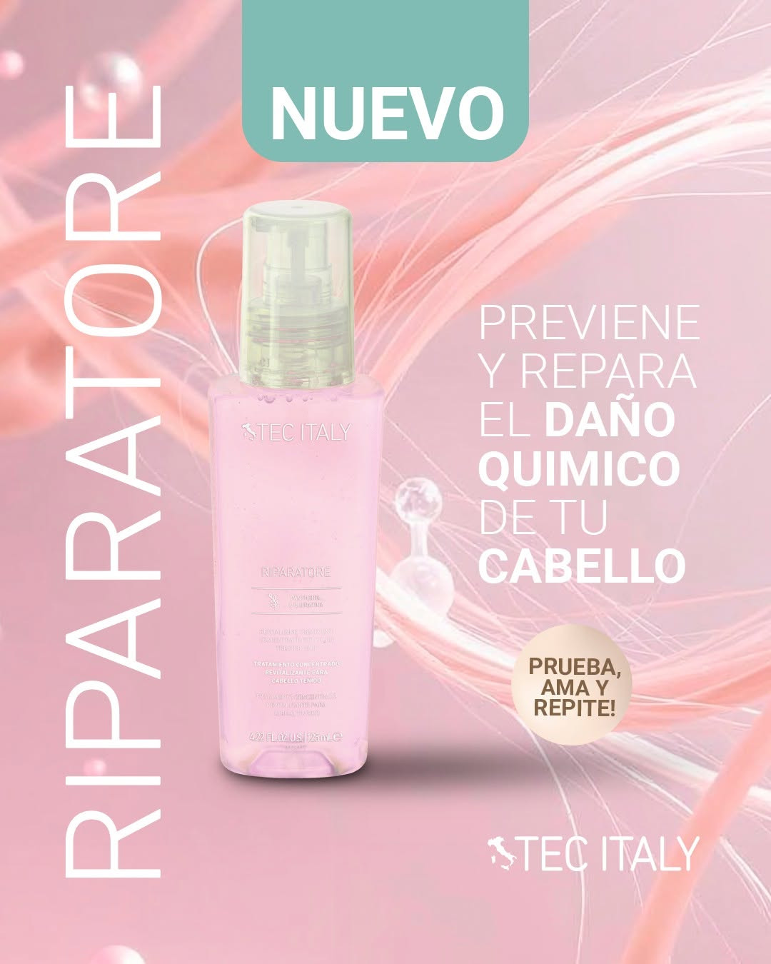 Riparatore de Tec Italy Utiliza tecnología molecular para devolver fuerza, suavidad y brillo desde la primera aplicación, siendo ideal para cabello maltratado.