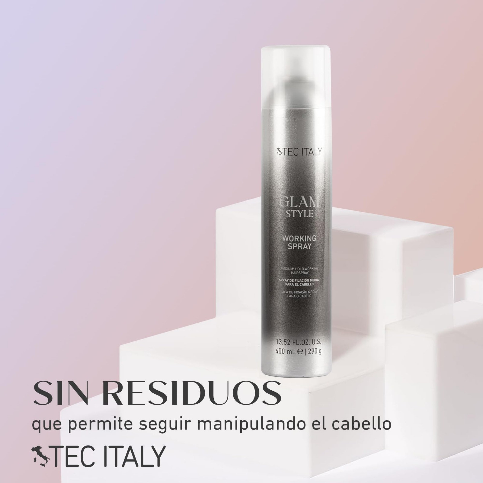 El Tec Italy Glam Style Working Spray es un spray de fijación media diseñado para peinar, dar estructura y movimiento natural al cabello sin dejarlo rígido. Permite manipular el cabello incluso después de aplicarlo, siendo ideal para acabados flexibles, peinados que requieren moldeado constante y todo tipo de cabellos.